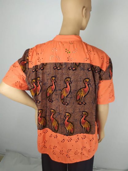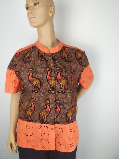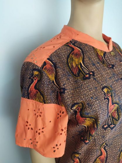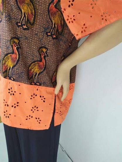 Blusa de algodón de talla grande con estampado exótico y cenefa de encaje. Talla 50-56