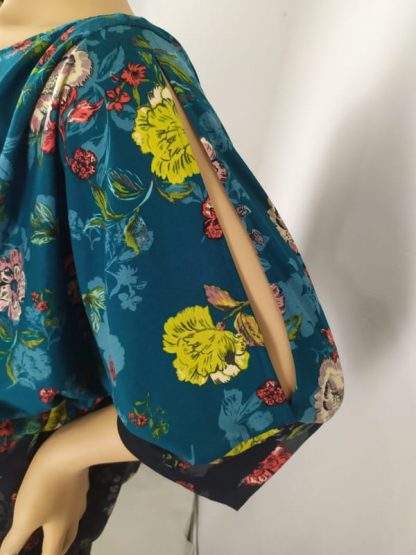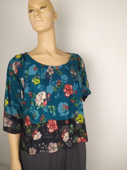 Blusa verde esmeralda, talla grande. Casual/fiesta , punto de algodón, estampado floral acabado con cenefa ,escote en V acabado con un vivo, que se enlaza en el medio del escote. Hombro en dos tablas y la abertura en la manga. Largo de la manga hasta el codo.