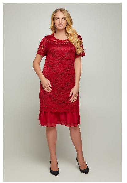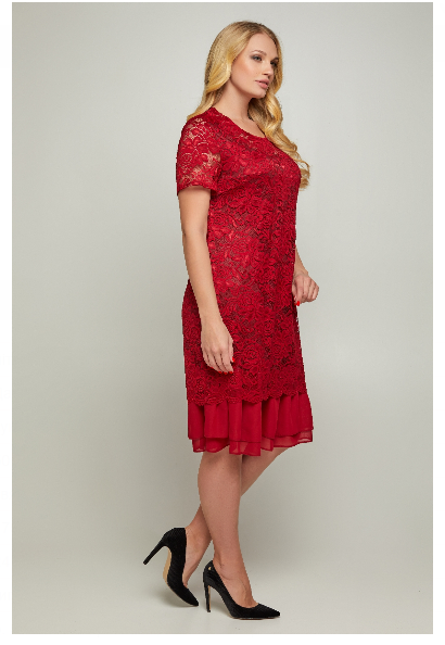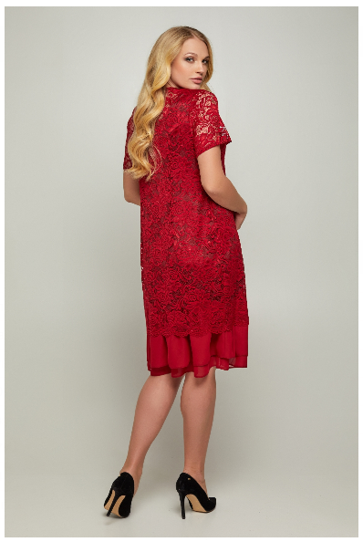 Vestido de fiesta confeccionado en guipur. Forro de tela de aceite de jersey . Manga corta de una sola costura. Lo más destacado del modelo es un volante de gasa en la parte inferior. Luce armonioso con zapatos de cuña y tacones. Talla 46-48. Color rosa pálido.