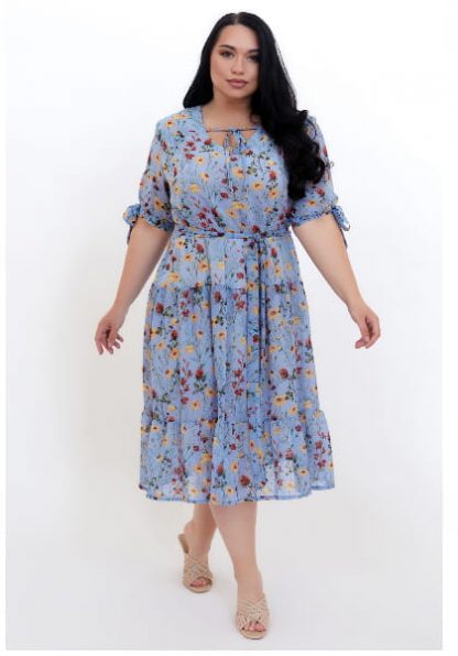 Vestido de gasa con estampado floral.  Para mayor comodidad, se proporciona un forro de punto opaco. Con el cinturón incluido.  La manga es corta en un puño con lazos.
