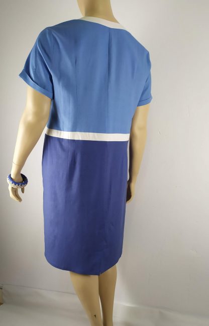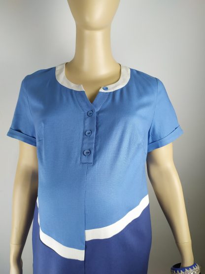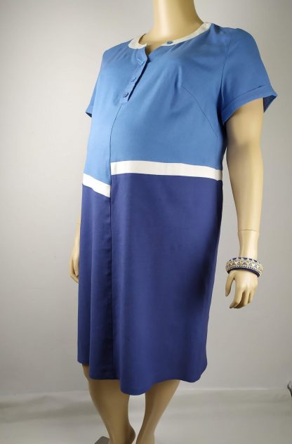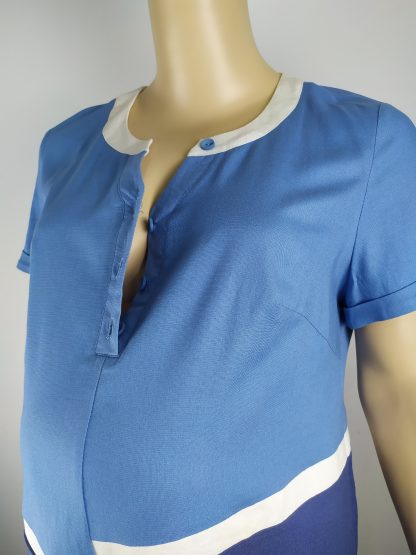 Vestido de lino , corto , bicolor con adornos blancos. Cuello Mao con abertura en pecho con botones .Premamá. Talla 54-56.