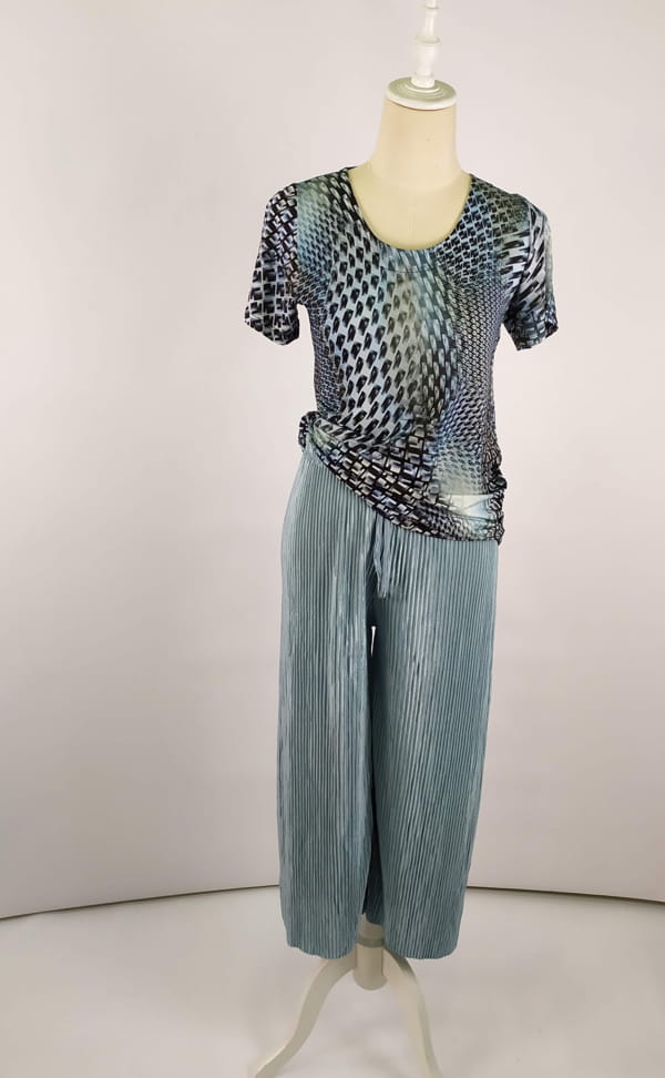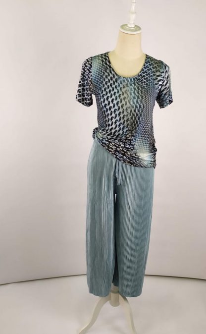 Conjunto de bermudas plisadas, cinturilla elástica, poliéster y camiseta de estilo deportivo. Talla 40