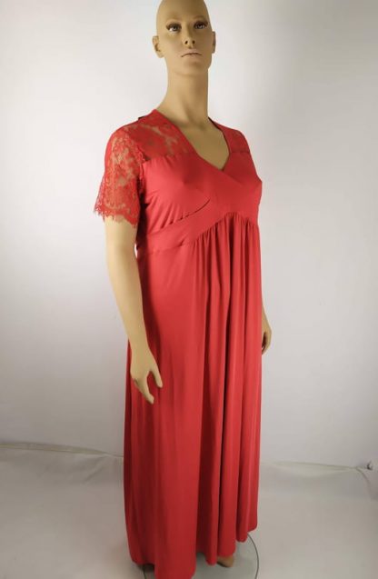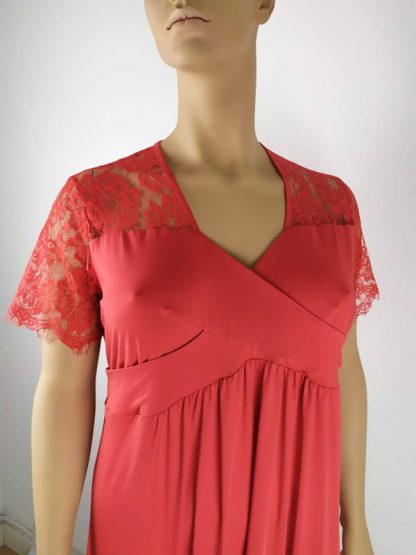Vestido de fiesta de color rojo , la zona de hombros y mangas de encaje. El cruce del pecho se prolonga a unos lazos que se ajustan en la espalda. Talla 48-54